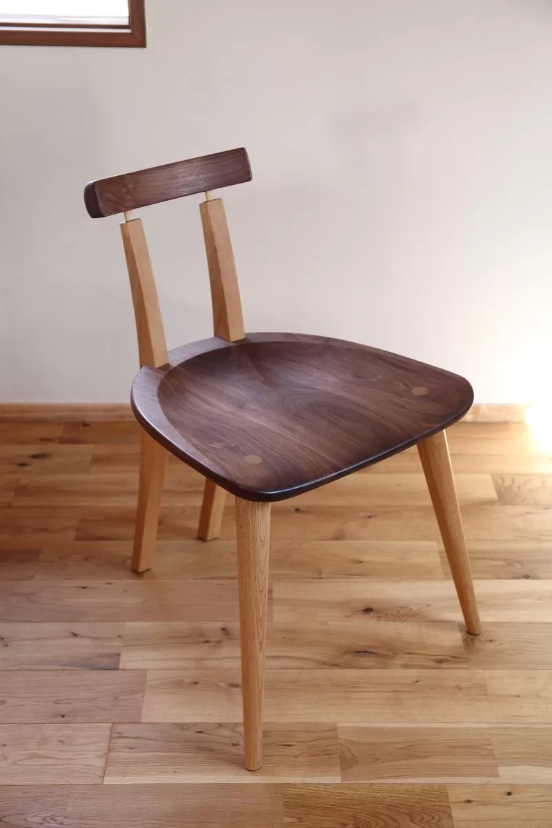 Bowチェアウォールナットの深い色と楢(ナラ)の材色の違いをデザインに生かしました。座面にホゾ加工を施し後ろ脚と接合、背面に見える通しホゾがアクセントになっています。 ショールームで展示中座り心地をお確かめください。 無垢材・ウォールナット&北海道産ナラ¥134,000 後ろ脚の弓型(bow)が名前の由来 無垢ナラのテーブルとbowチェア