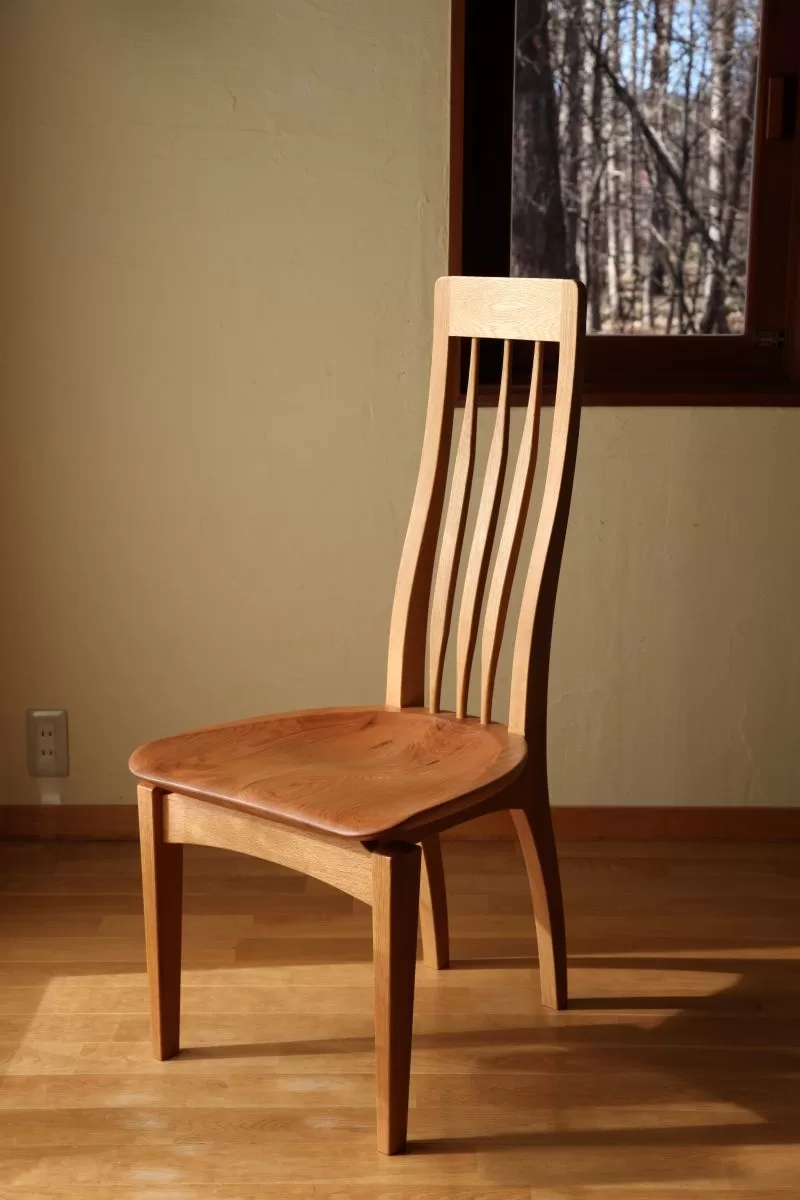 hanonチェアhanonチェア 音符のような曲線をもったシルエットの美しさと、その曲線、曲面が特に腰を支え、無理のない姿勢で座れるよう制作した木の椅子です。 座板には比較的熱伝導率の小さいクルミ材を使い、軽量化と、座ったときの温かみを考慮しています。全てクルミ無垢材仕様¥140,000ウォールナット&座板クルミ¥145,000北海道産のナラ&座板クルミ¥145,000