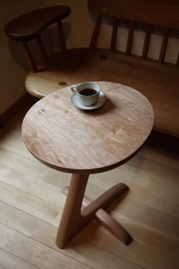 サイドテーブル座る人の足とできるだけ干渉しないようデザインしています。高さは2種類。H460とH540からお選びいただけます。 北海道産クルミ材 H460 ¥77,000 H540 ¥79,000(現品販売できます) サイドテーブルとパーソナルチェア サイドテーブルと背付き豆ベンチ